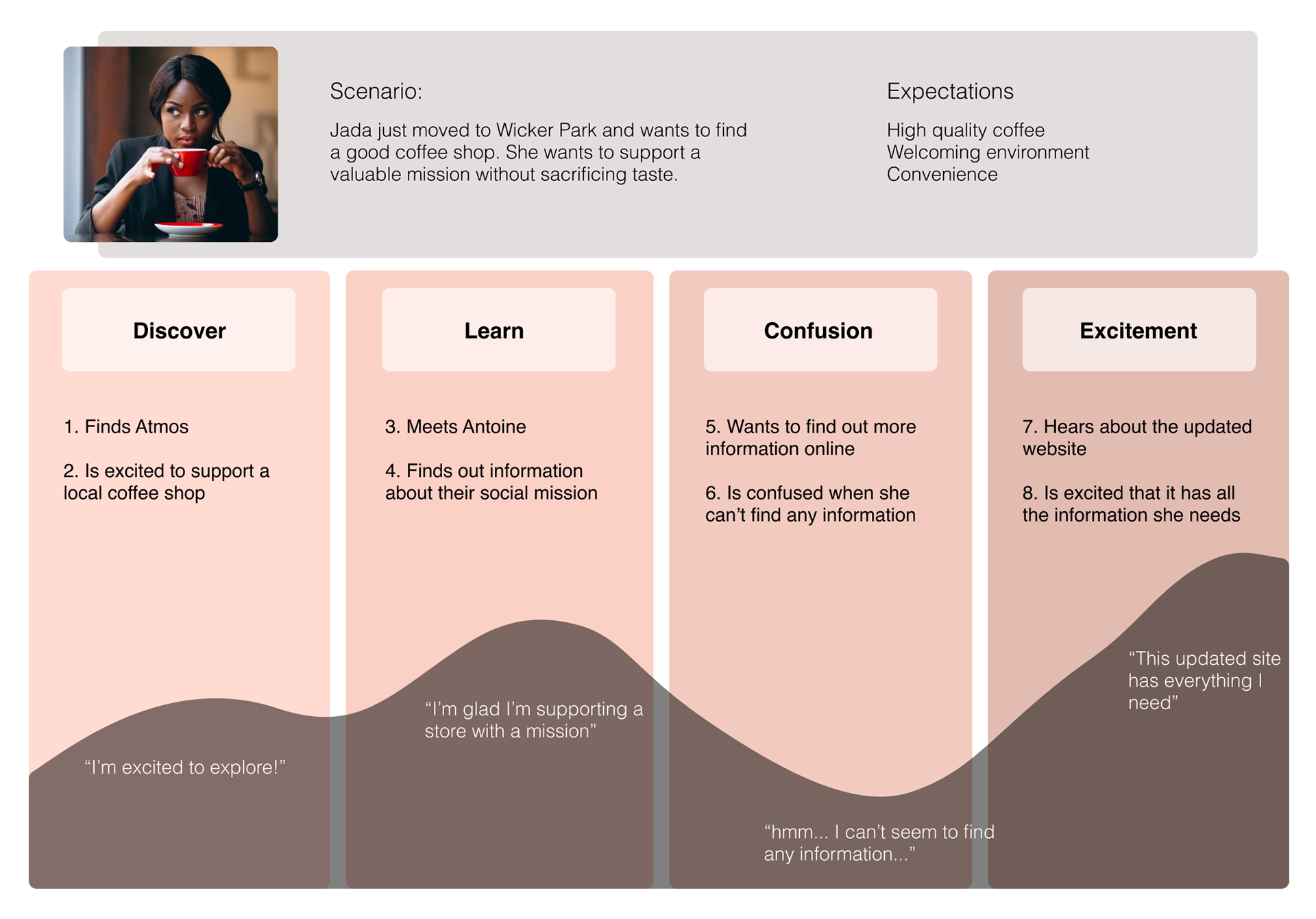 The journey map we created visualized for our client the discrepancy between what customers were expecting to find from his website and what their actual experiences were. When used tangentially with the persona, our client was able to grasp a much better concept of what user's were feeling and why.